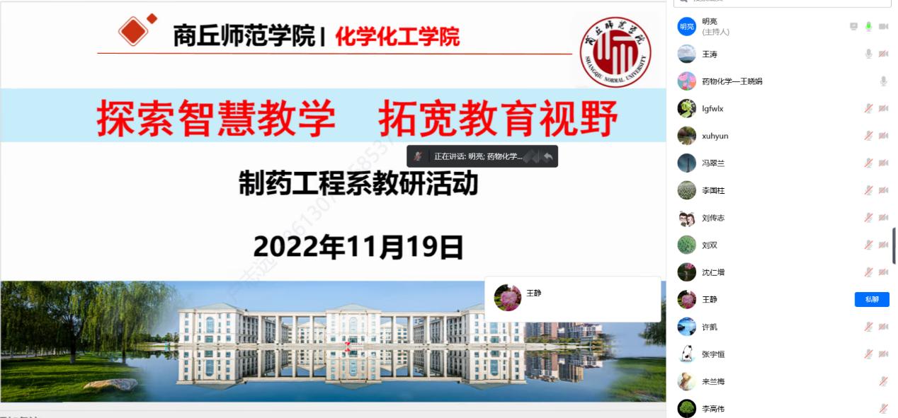 11月19日下午,制药工程系在线召开“探索智慧教学、拓宽教育视野”教研活动,副经理王涛和制药工程系全体老师参加了此次活动,活动由系副主任张明亮主持。