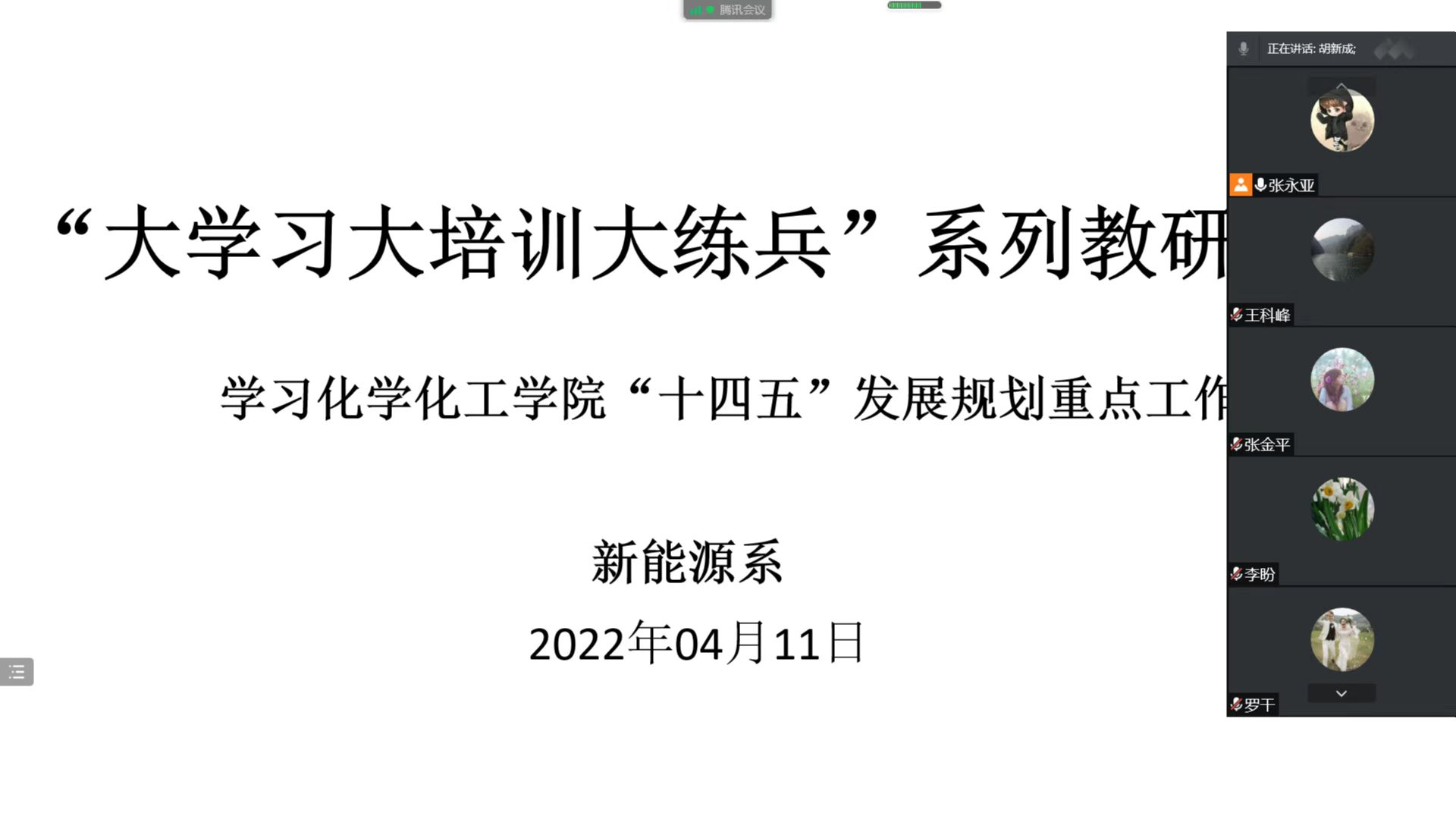 为了促进公司学科专业更好的发展,结合公司能力作风建设年活动以及公司“十四五”发展规划重点工作任务,4月11日,新能源系采用腾讯会议召开了“大学习大培训大练兵大提升”系列教研活动暨公司“十四五”发展规划重点工作研讨交流会,本次活动由新能源系主任胡新成主持。